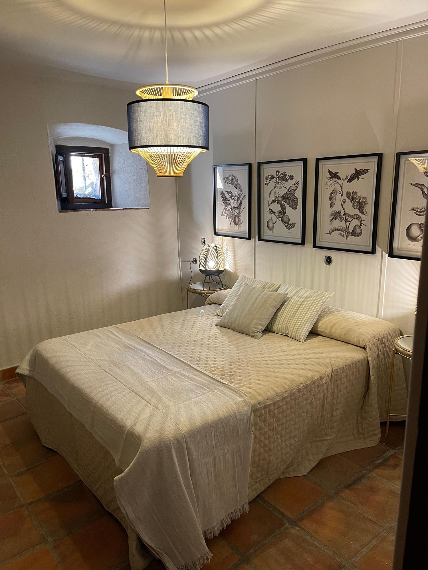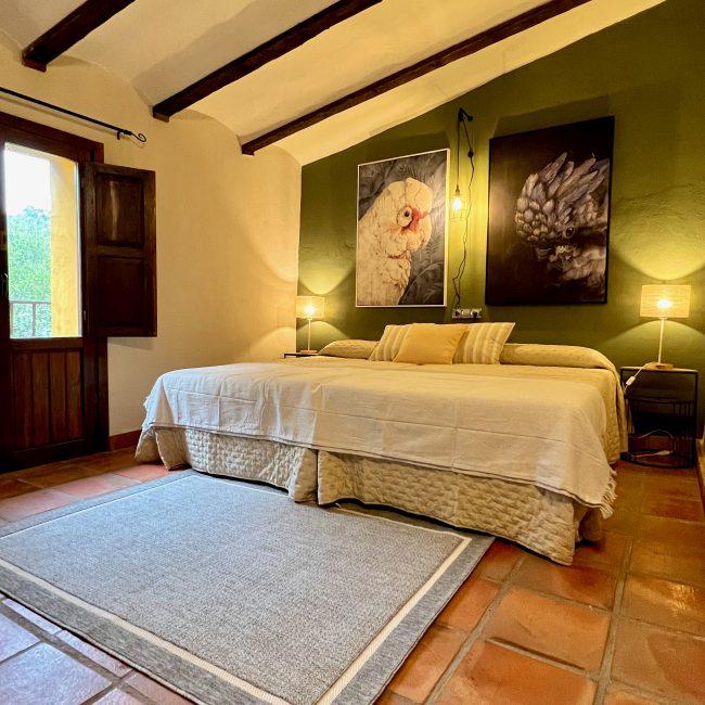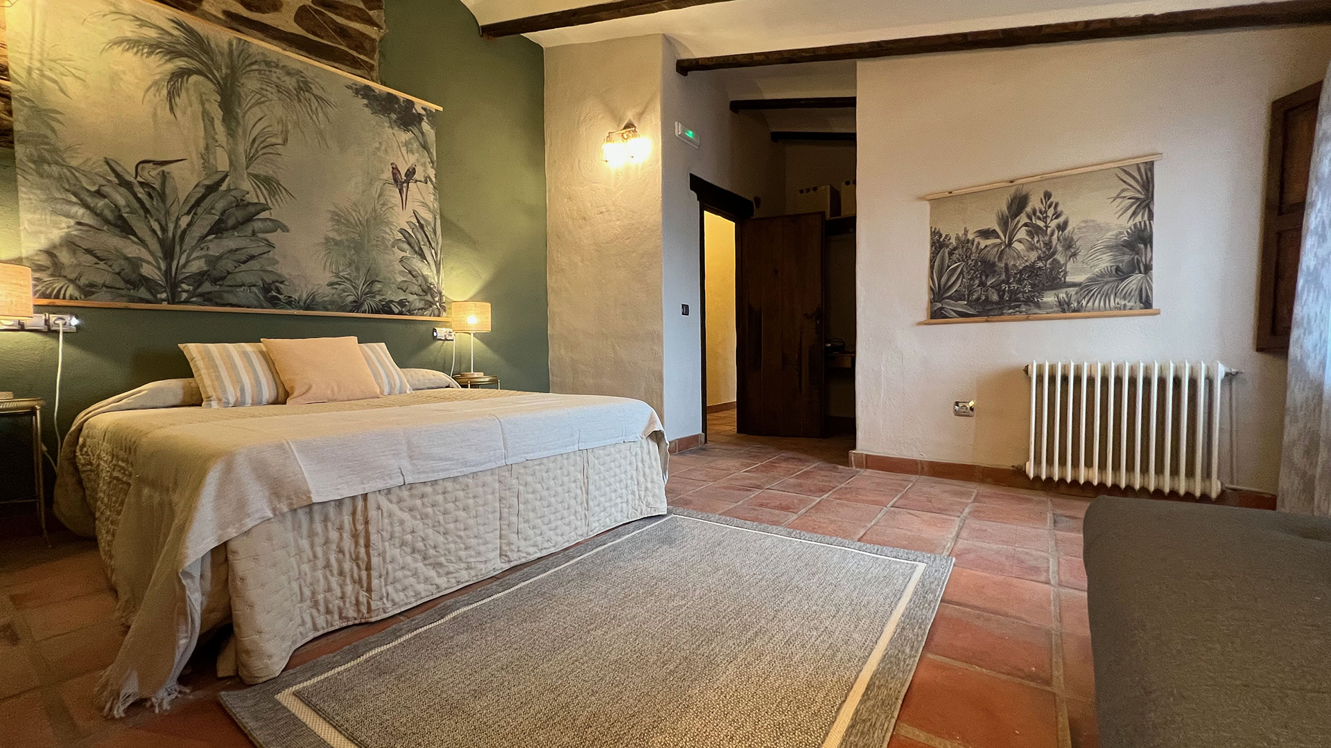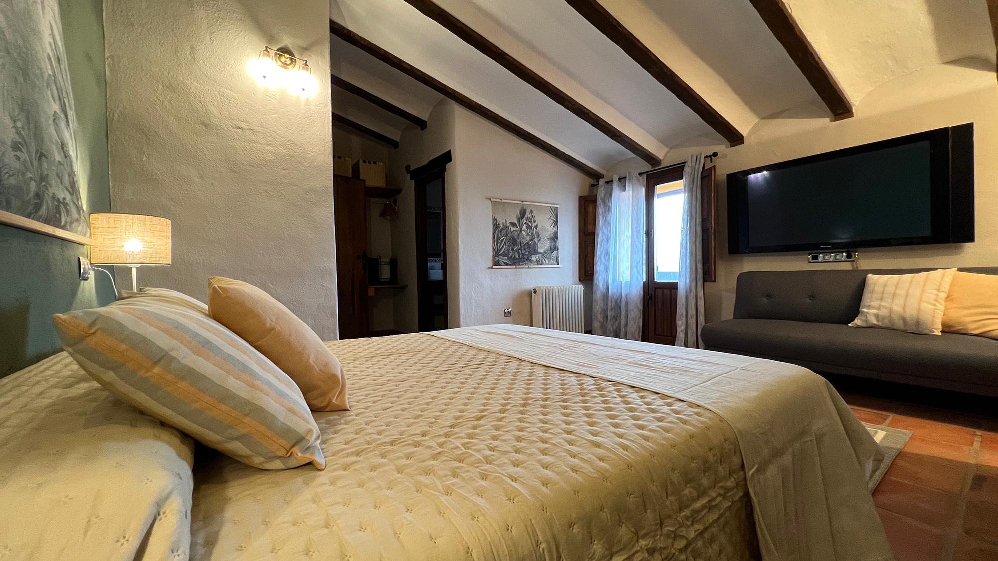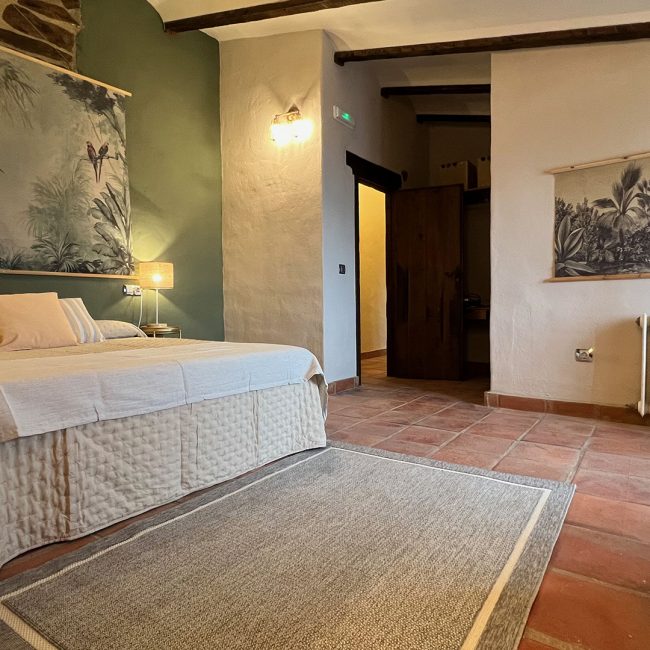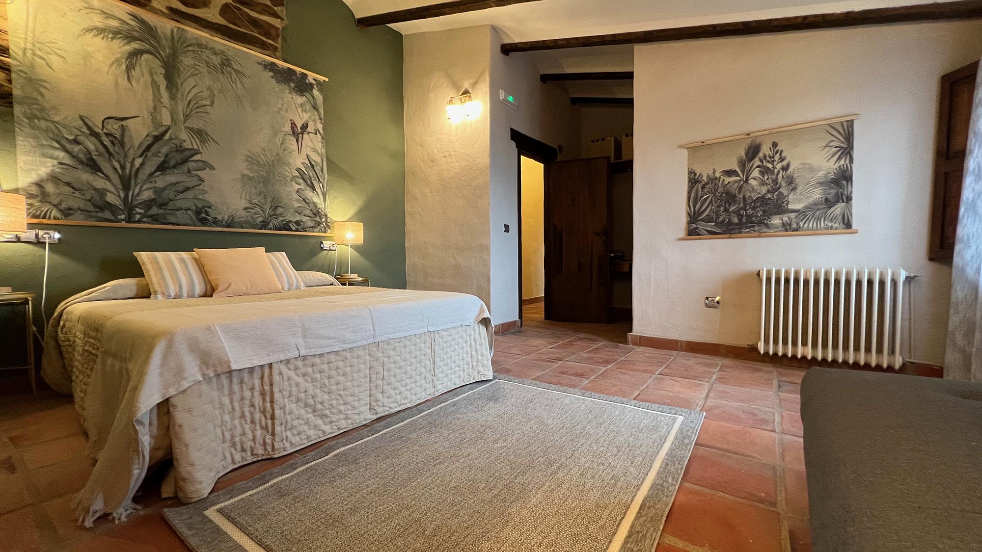 Habitación amplia con cama de matrimonio con baño propio y salida a la terraza.