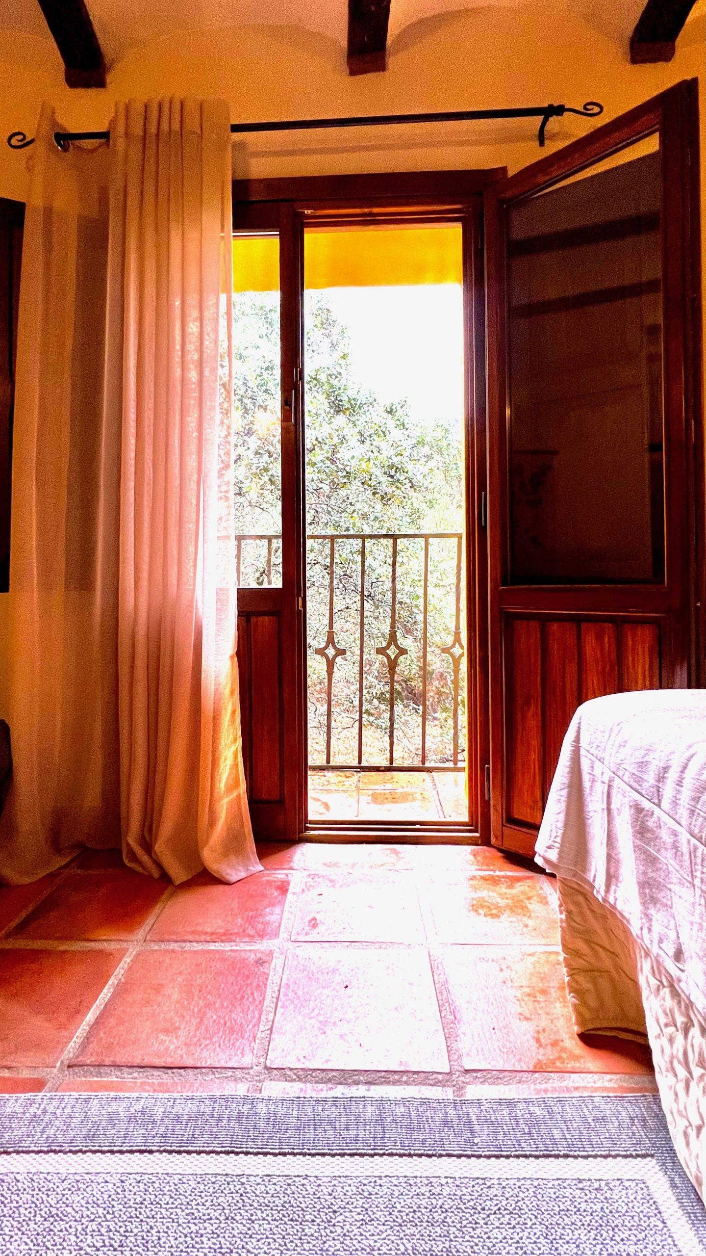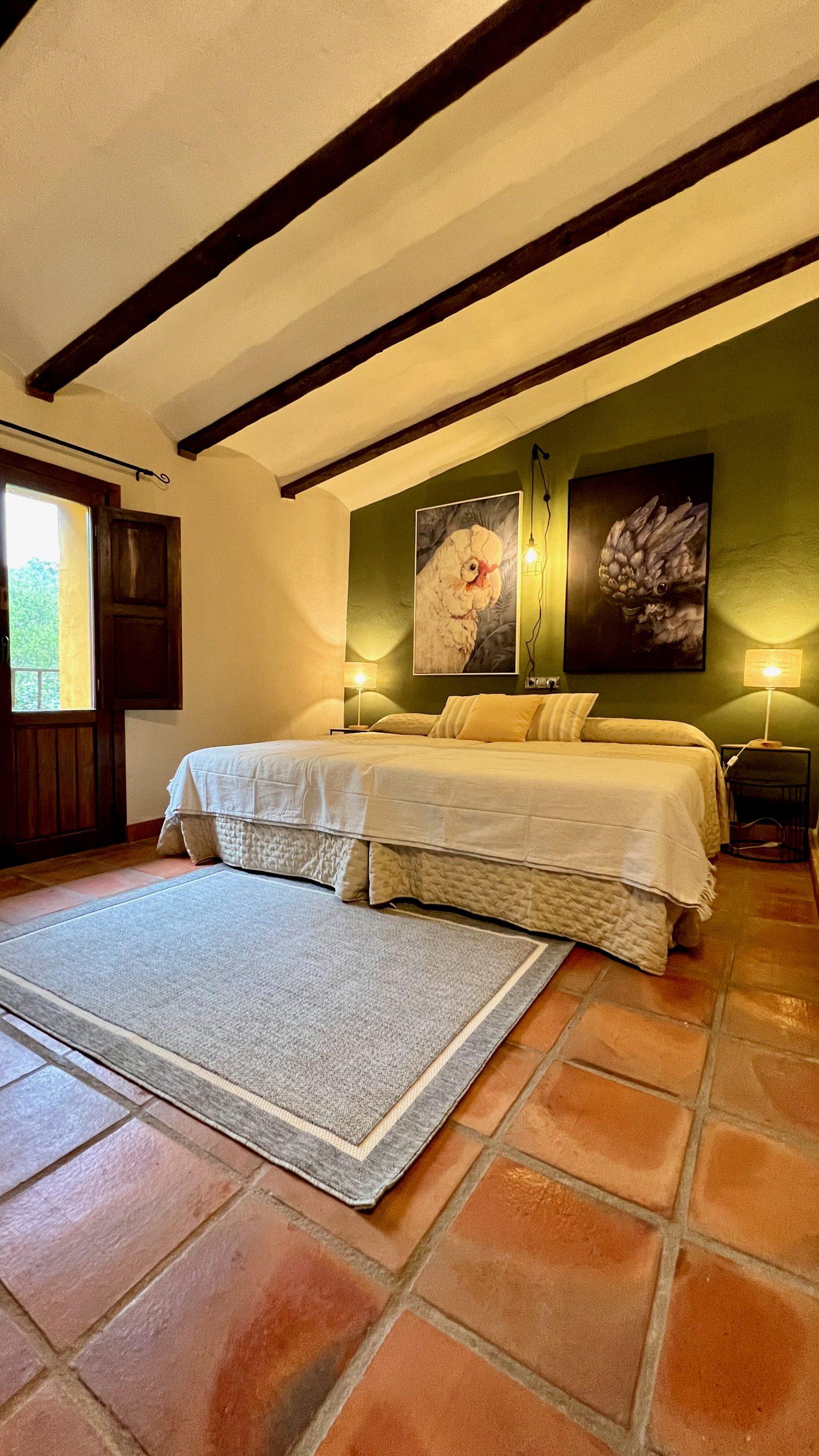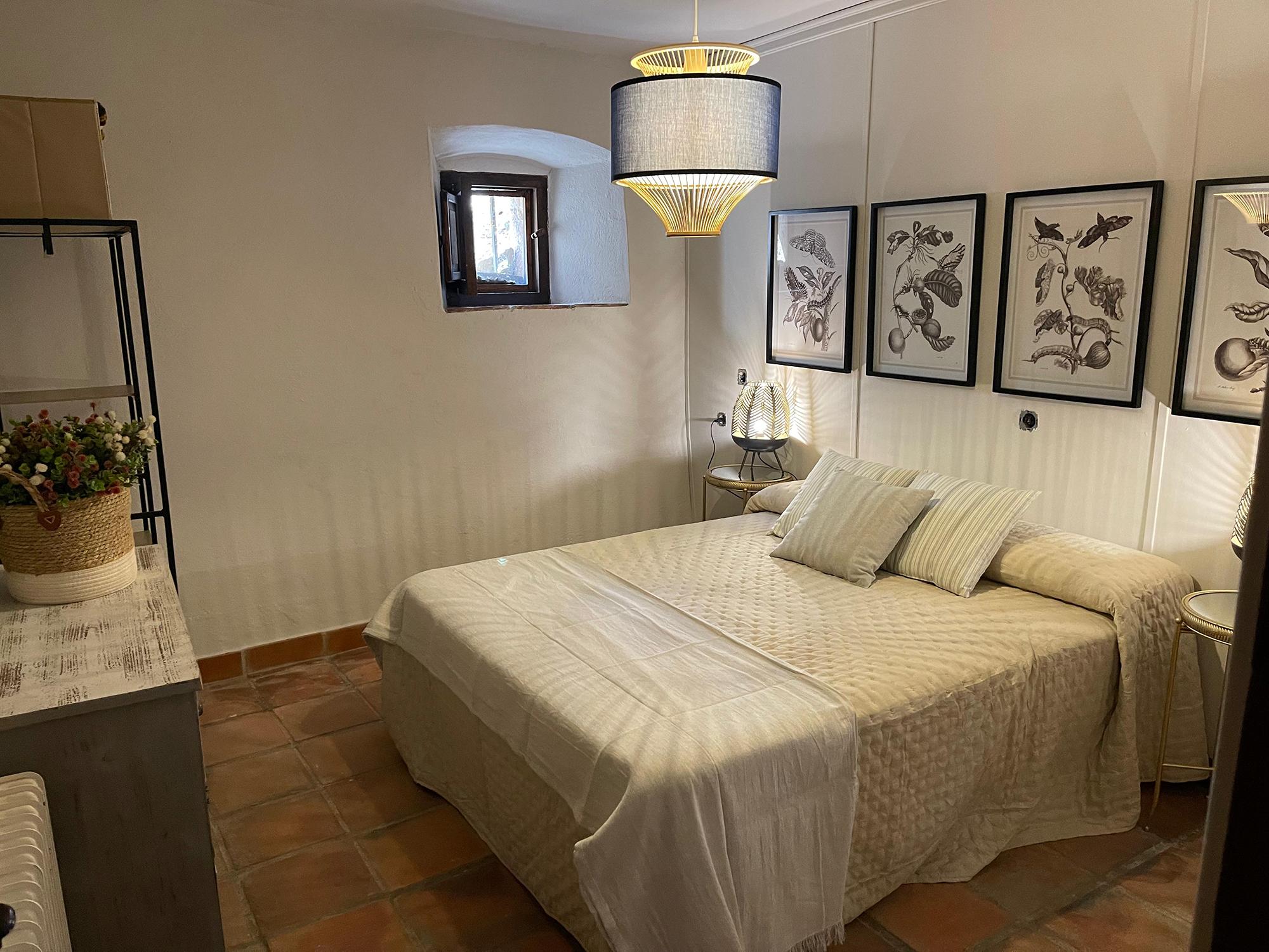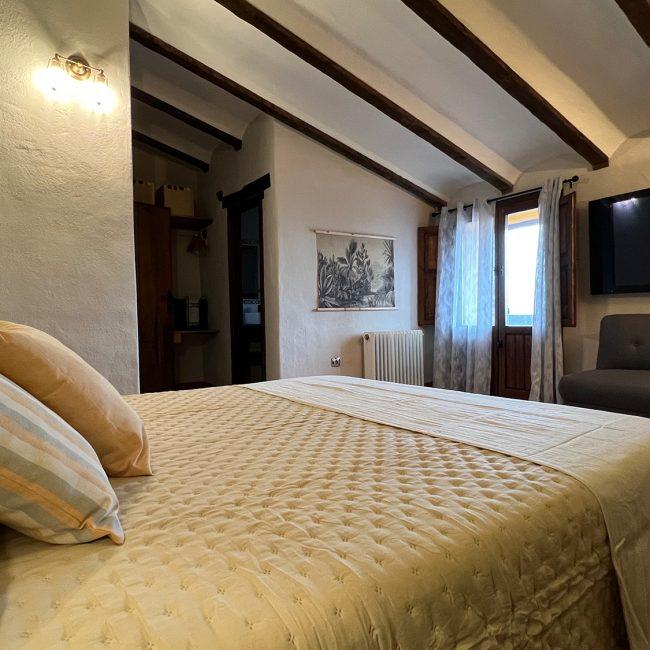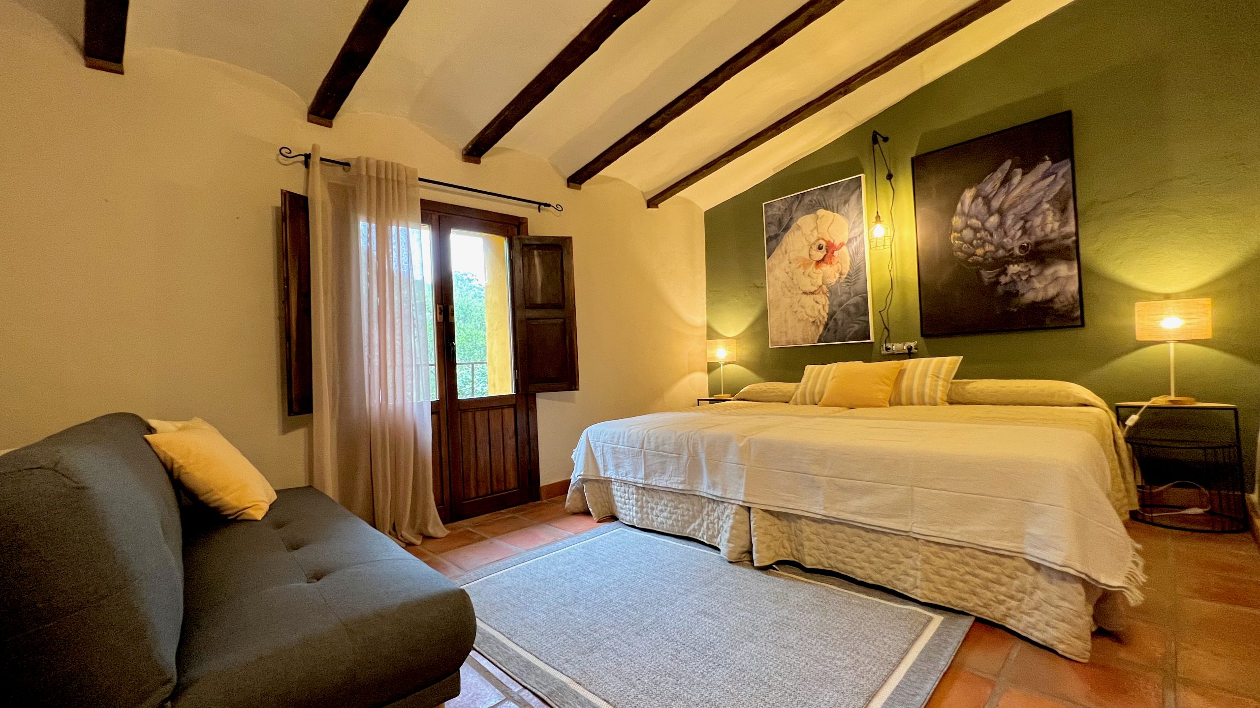 Habitación amplia con cama de matrimonio con baño propio y salida a la terraza.